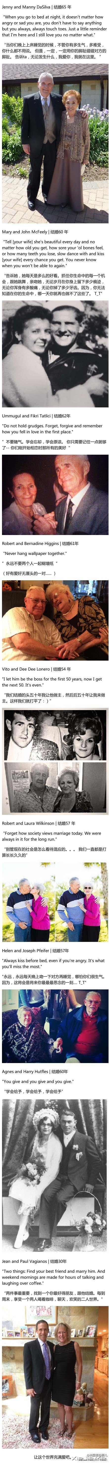 在这个离婚率居高不下的时代,一家报纸采访了9对结婚超过50,60年的夫妇,让他们用一句话说出保持相爱的诀窍。。 这就是这9对夫妇他们加起来一共506年的爱情的答案~~~ 看完好暖人。via 英国那些事儿的微博